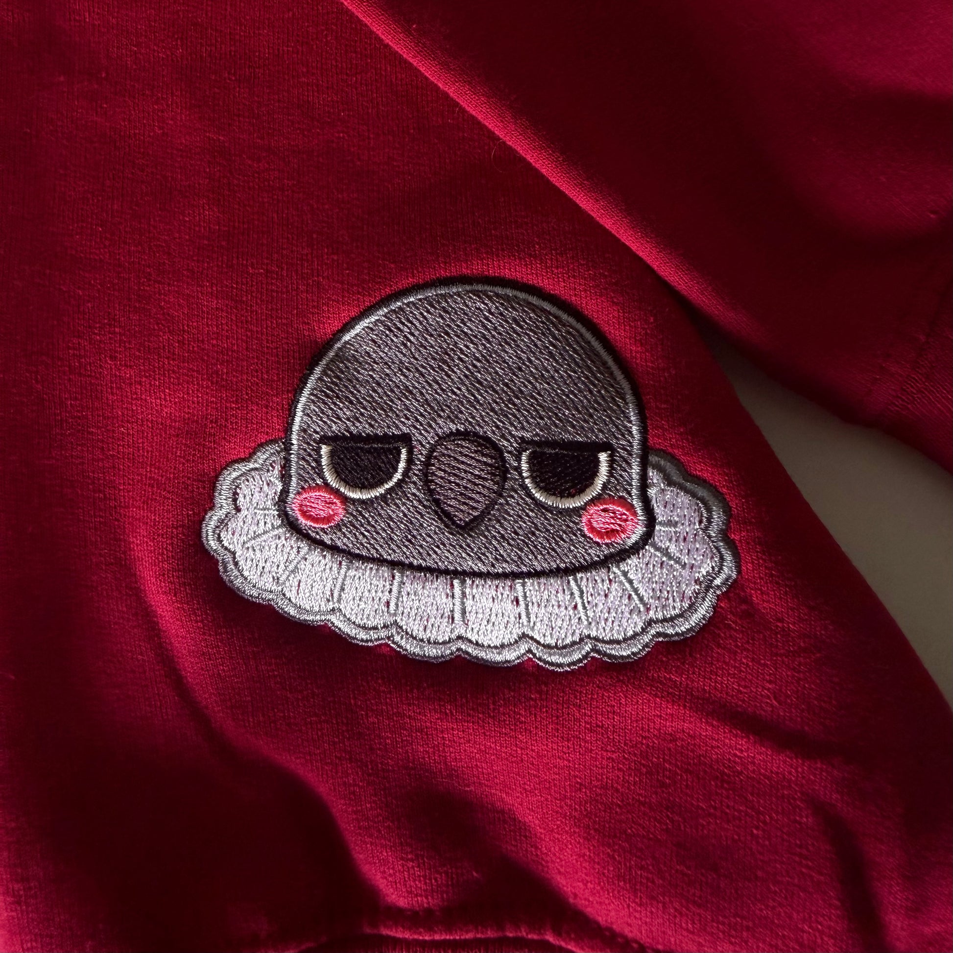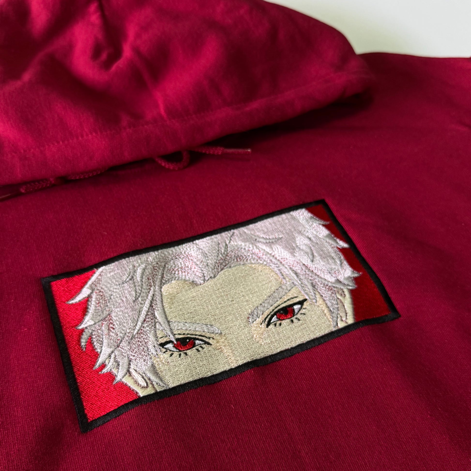 This fan-made Love and Deepspace embroidered sweatshirts features your favorite love interest eye design on the middle chest with their mascot on the back left corner.